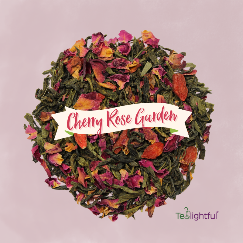 Cherry Rose Garden — Organic green tea, cherry, organic goji berries, organic rose petals, natural cherry and cream flavors.