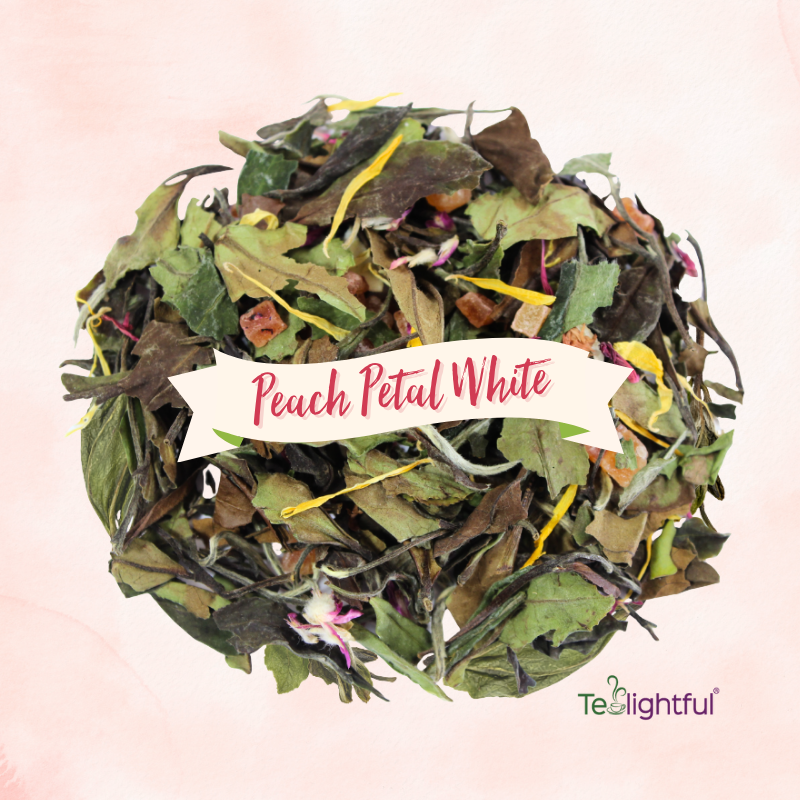 Peach Petal White— Organic white tea, organic calendula, organic pink cornflowers, papaya, and natural white peach flavor.