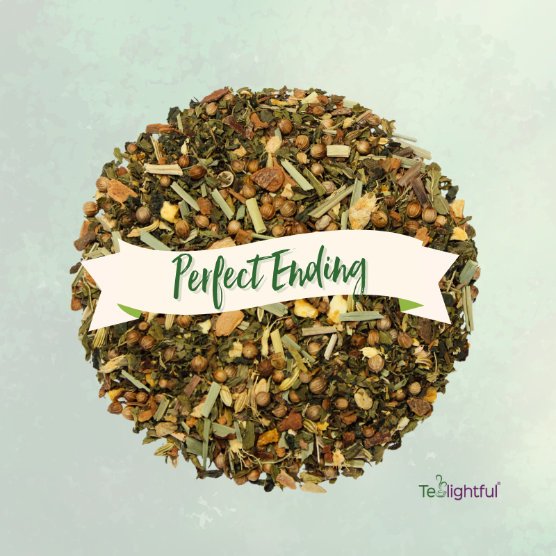 Perfect Ending — Organic nettle leaves, organic spearmint, organic lemongrass, organic ginger, organic cinnamon, organic clove, organic coriander, organic fennel, organic orange peel.