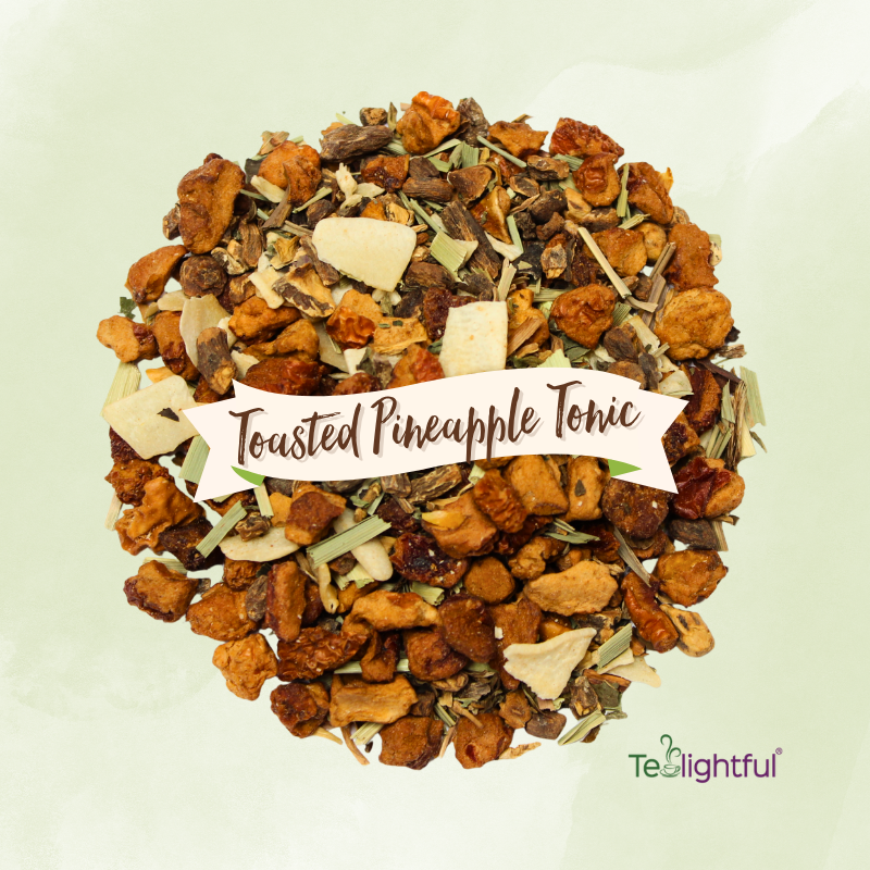 Toasted Pineapple Tonic — Pineapple, organic roasted dandelion root, organic lemon balm, organic lemongrass, coconut, and natural pineapple flavor.
