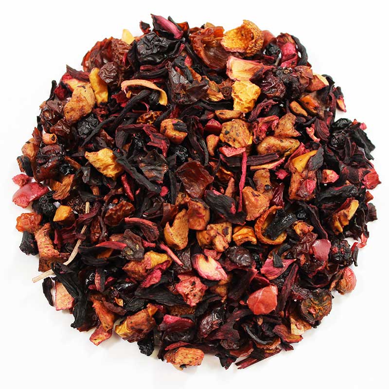 Organic Apples, Organic Cranberries, Organic Rose Hips, Organic Elderberries, Organic Hibiscus Petals, Dried Cherries, Sweet Blackberry Leaves, Rose Petals, Dried Raspberries, Natural Cranberry, and Cherry Flavors.